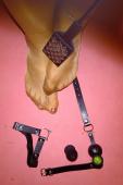 SONO CON TUTTI GLI ATTREZZI DEL MESTIERE (BDSM) POSATI A TERRA CHE FANNO DA CORNICE E HO IN MANO IL MIO AMATO FRUSTINO. SPALMO LA SBORRA TRA UN PIEDINO E L'ALTRO E POI USO IL FRUSTINO COME SPATOLA PER MOSTRARLA BENE: È TANTISSIMA, CALDA E BIANCA.